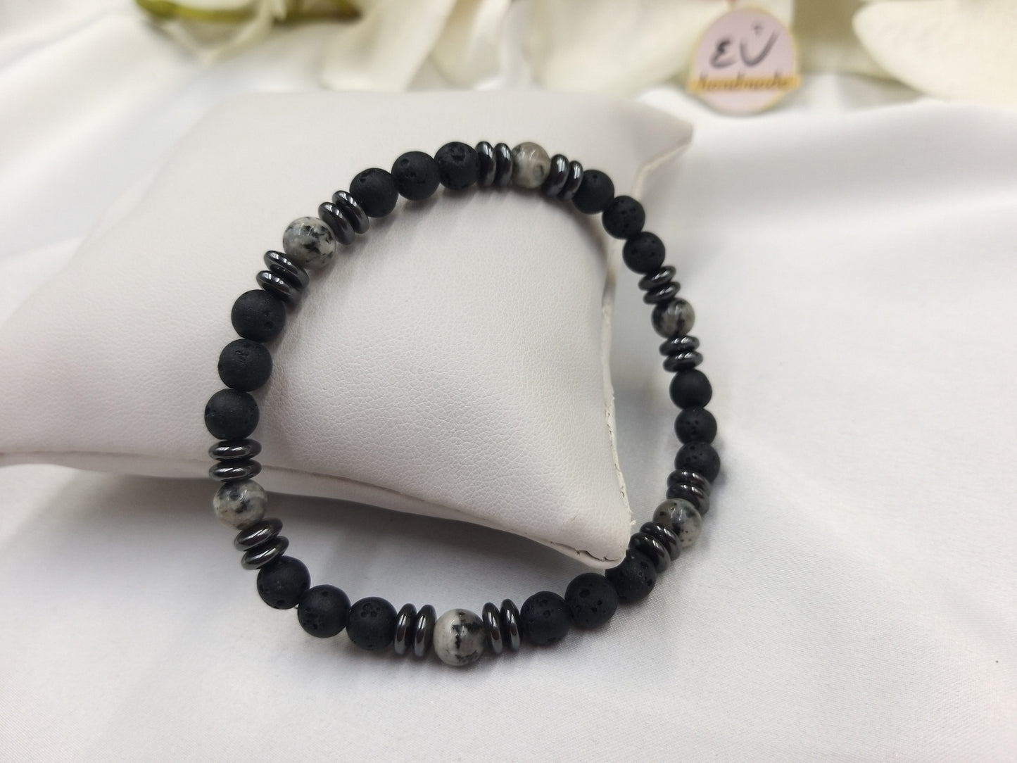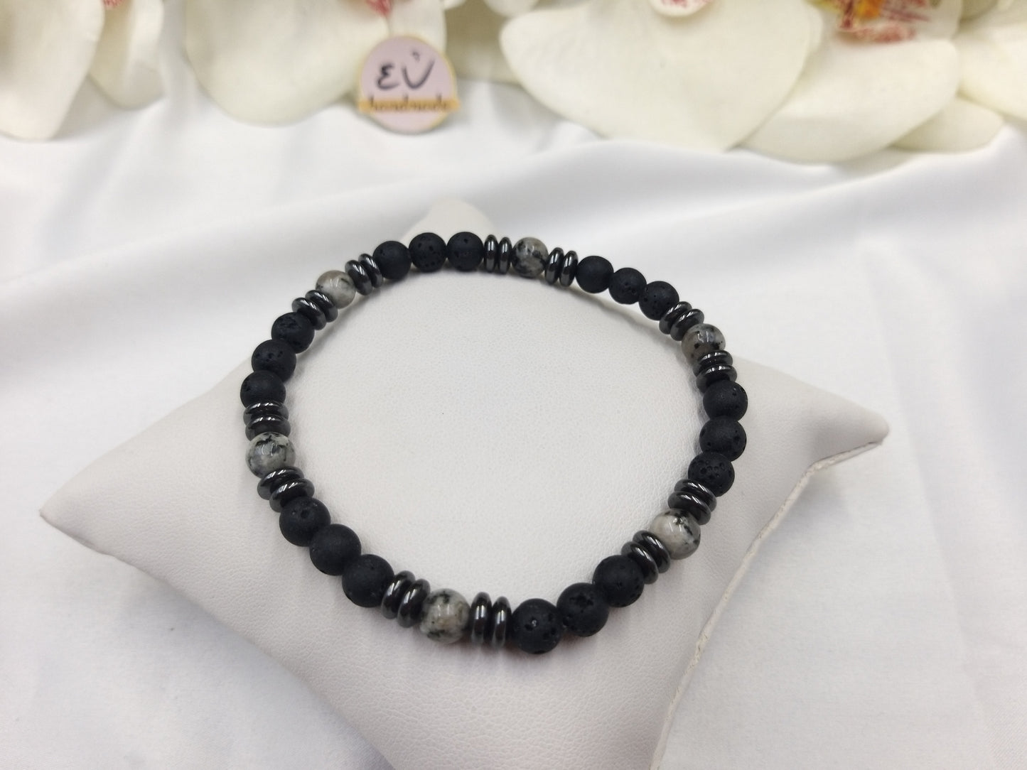 Χειροποίητο ανδρικό βραχιόλι με γκρι αχάτη, πέτρες μαύρης λάβας και ροδέλες φυσικού αιματίτη, δεμένο με ελαστική σιλικόνη.