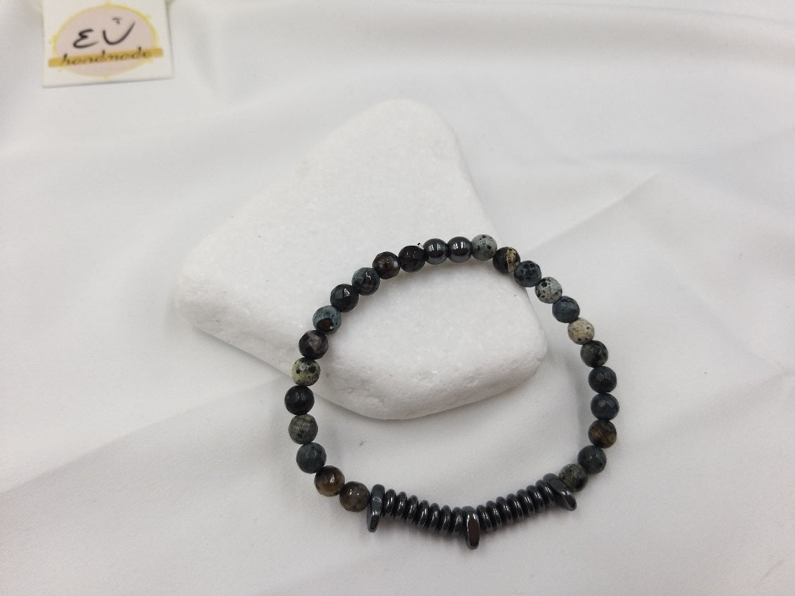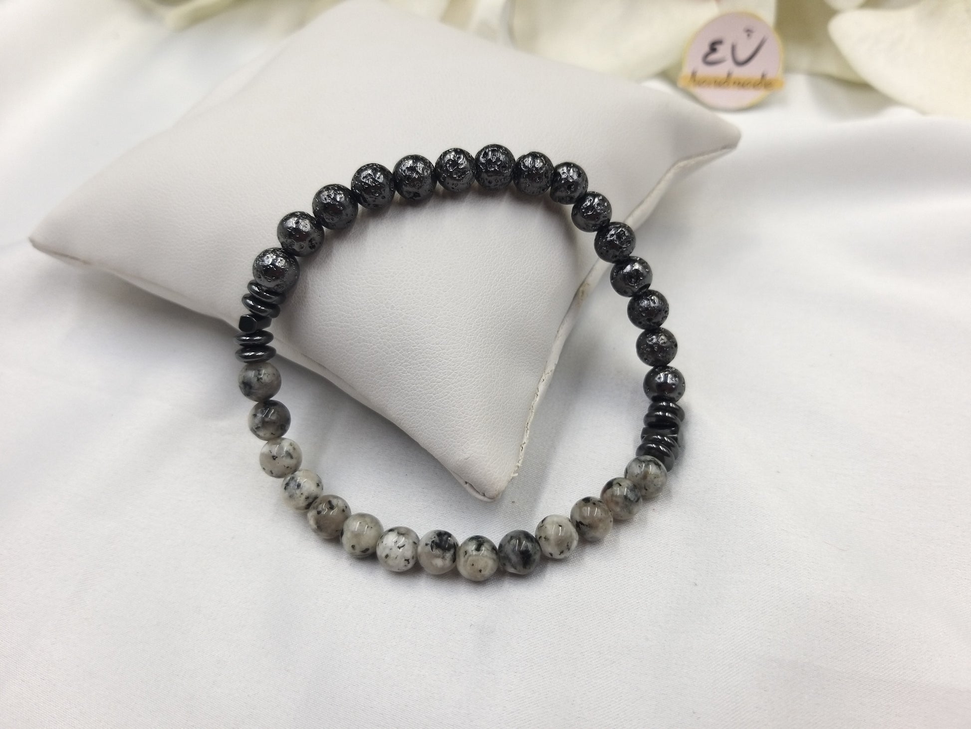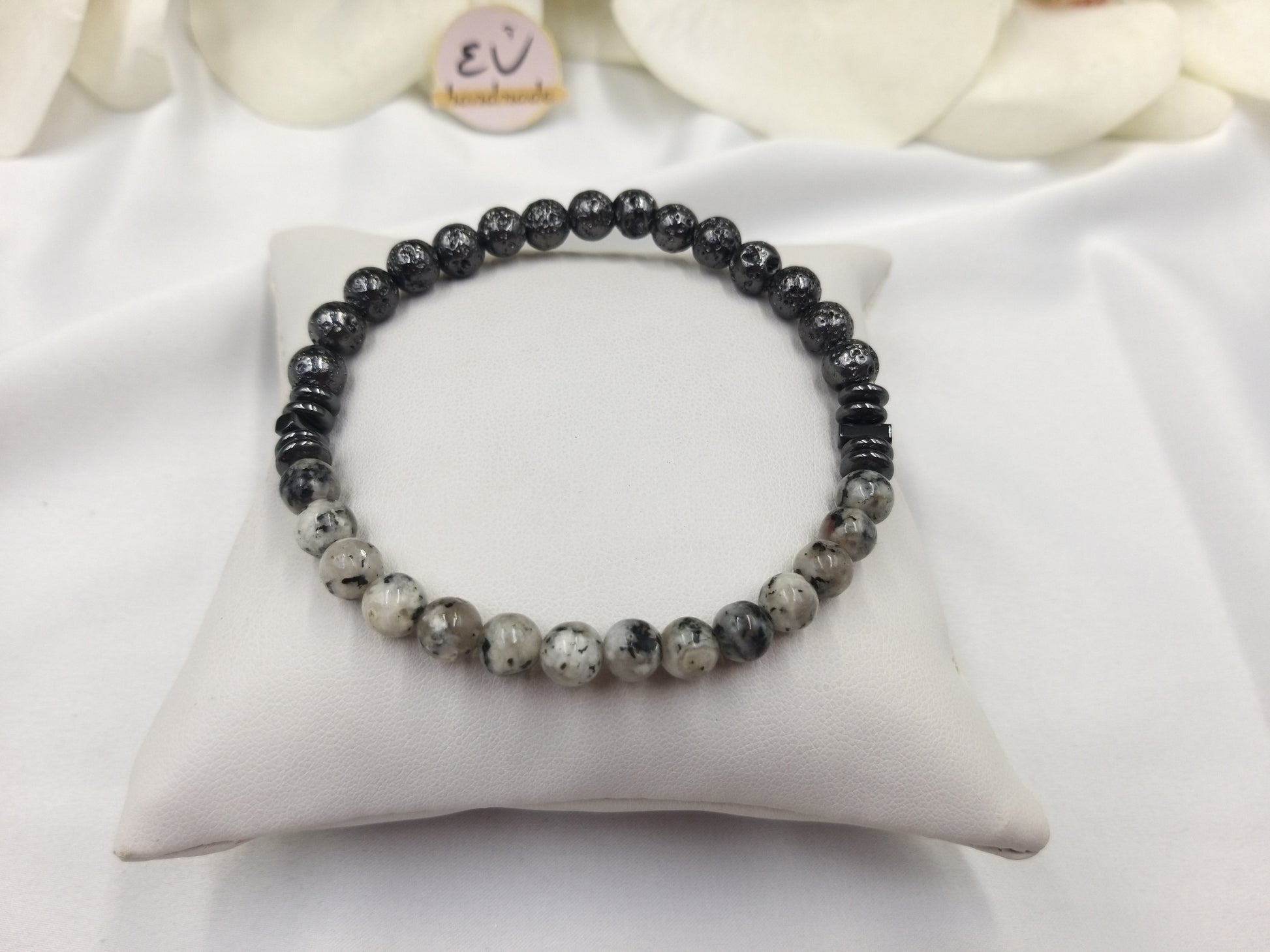 Χειροποίητο ανδρικό βραχιόλι με πέτρες γκρι αχάτη, ροδέλες φυσικού αιματίτη και πέτρες ανθρακί λάβας, δεμένο με ελαστική σιλικόνη.
