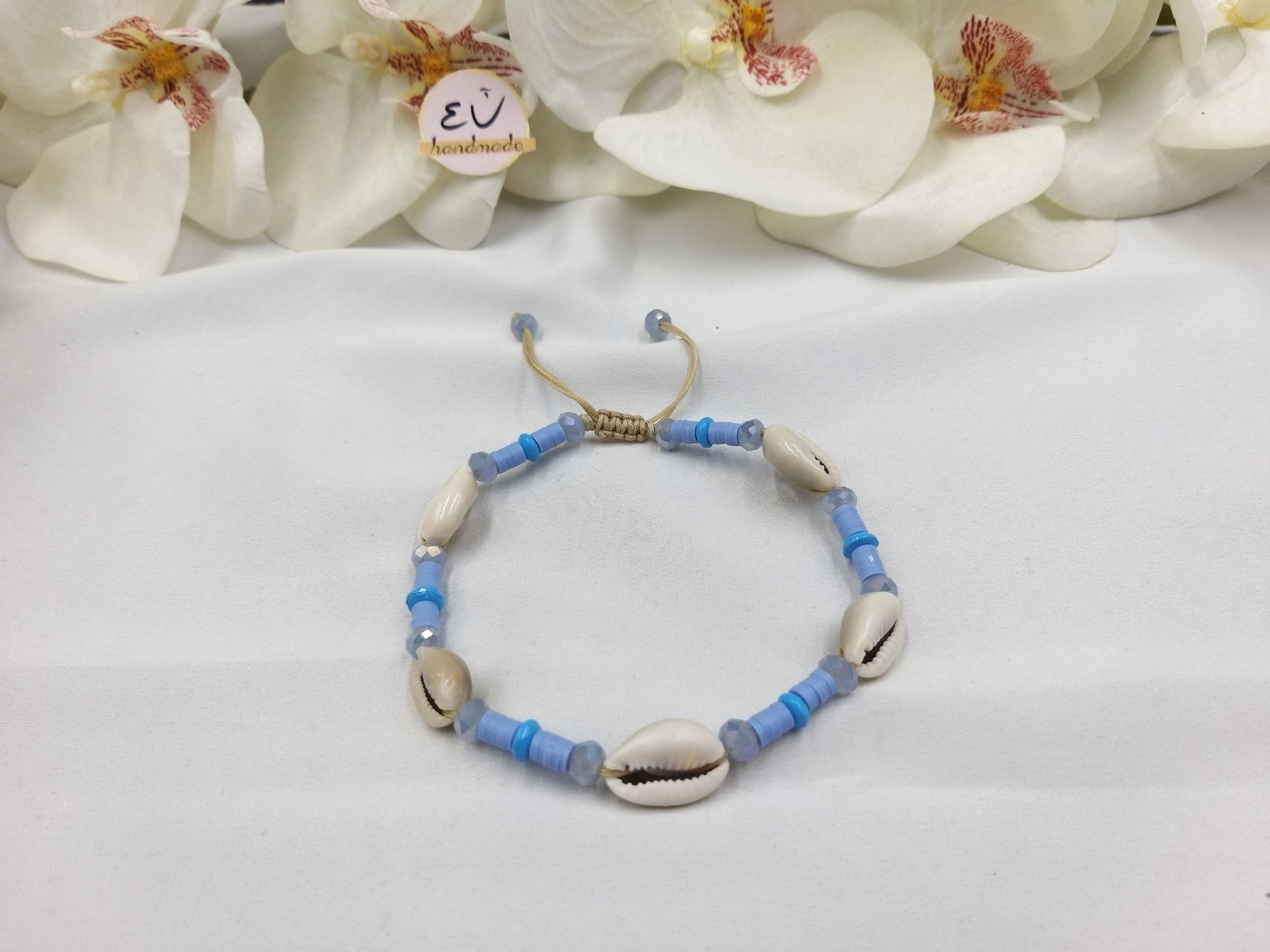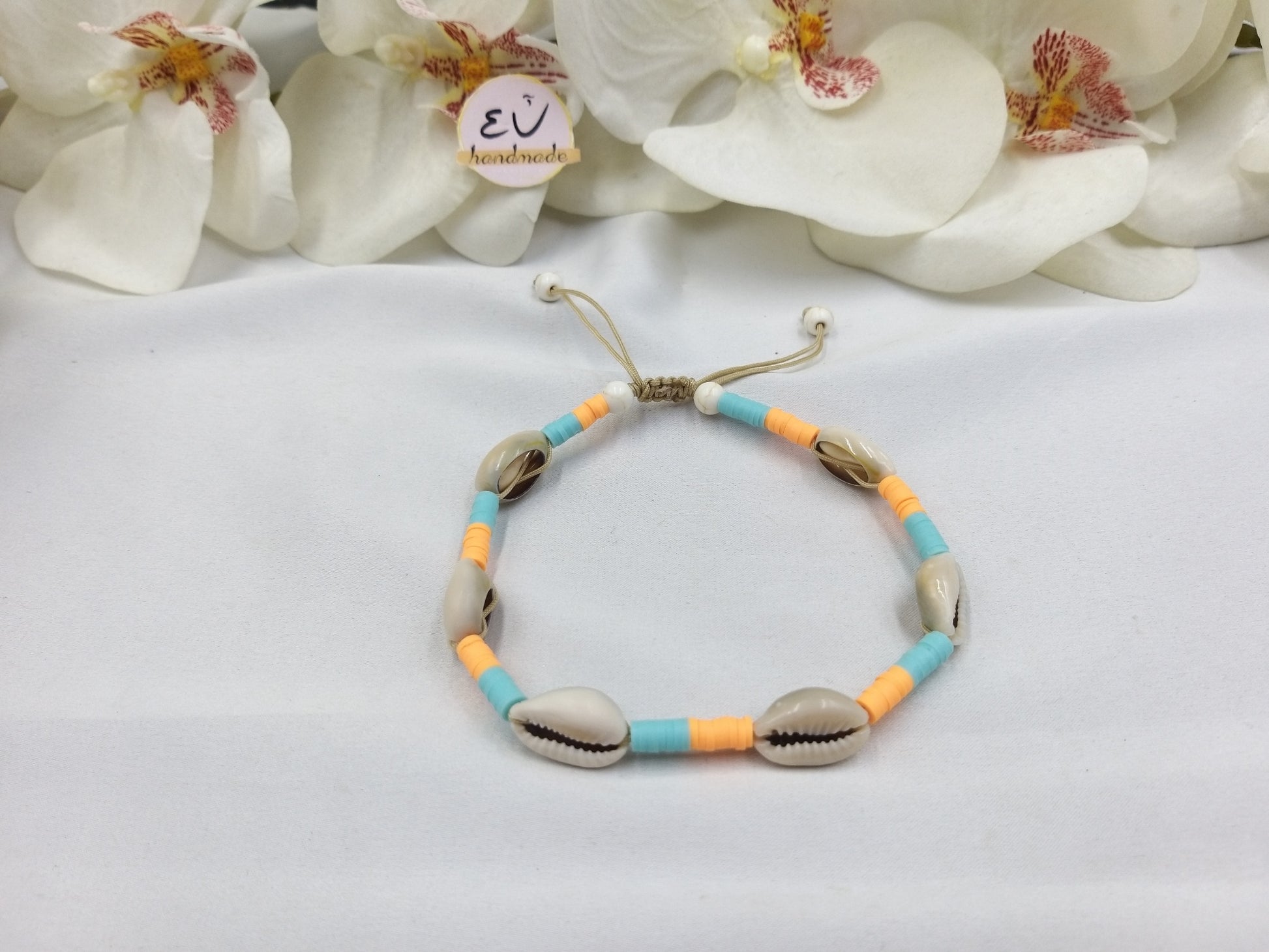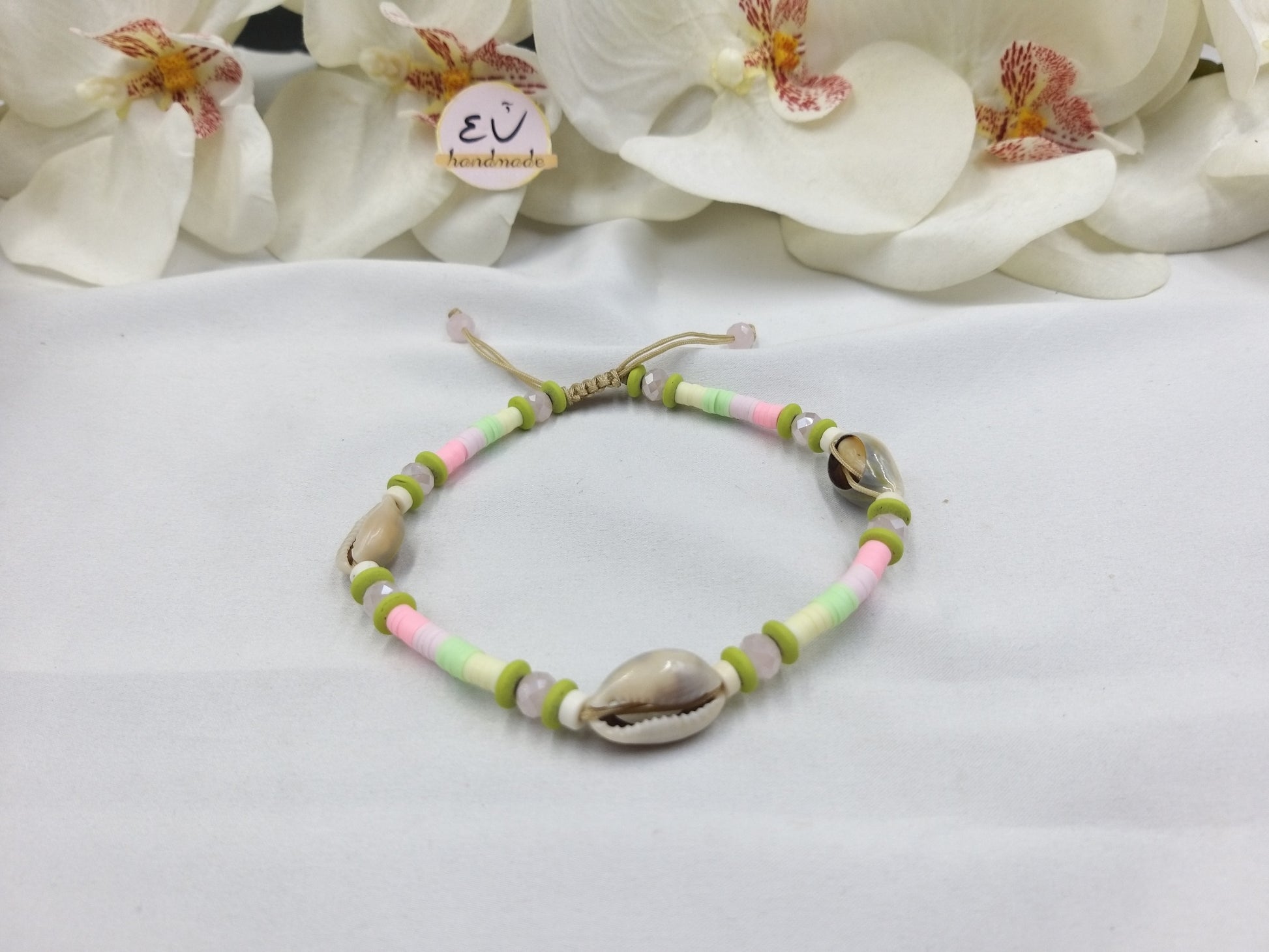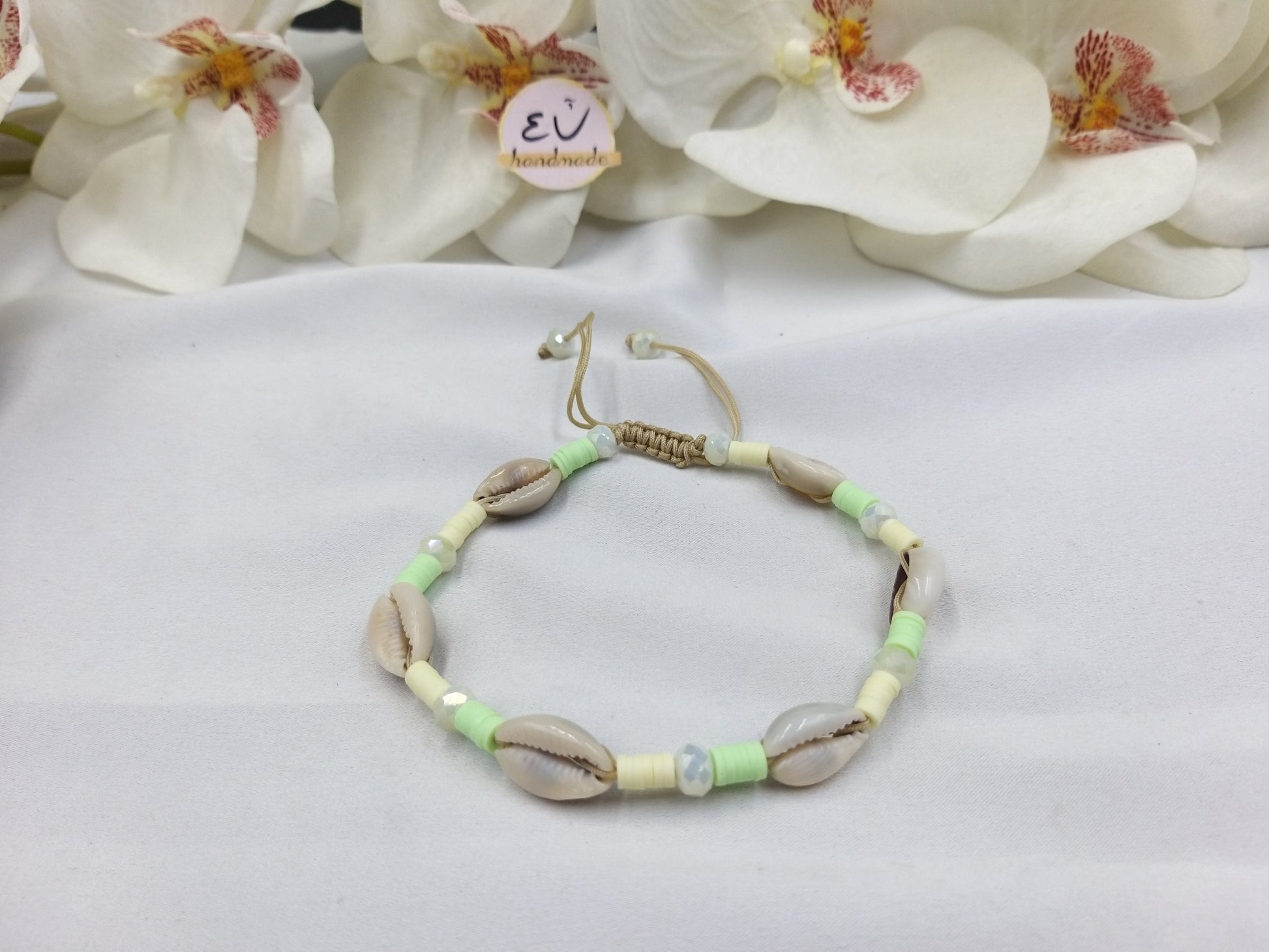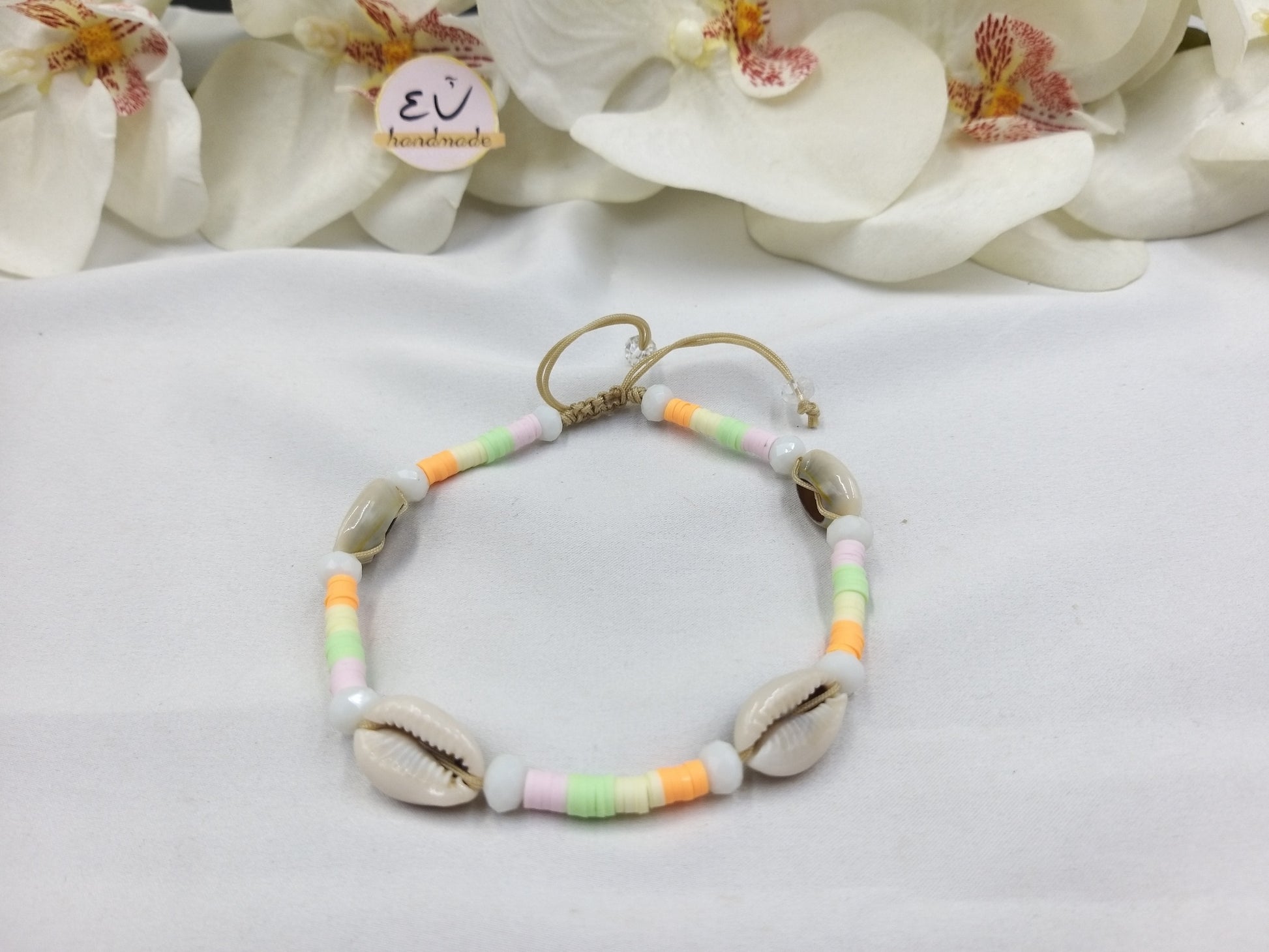 Χειροποίητο βραχιόλι ποδιού με σατέν μπεζ κορδόνι, κρύσταλλα, ροδέλες φίμο και κοχύλια.