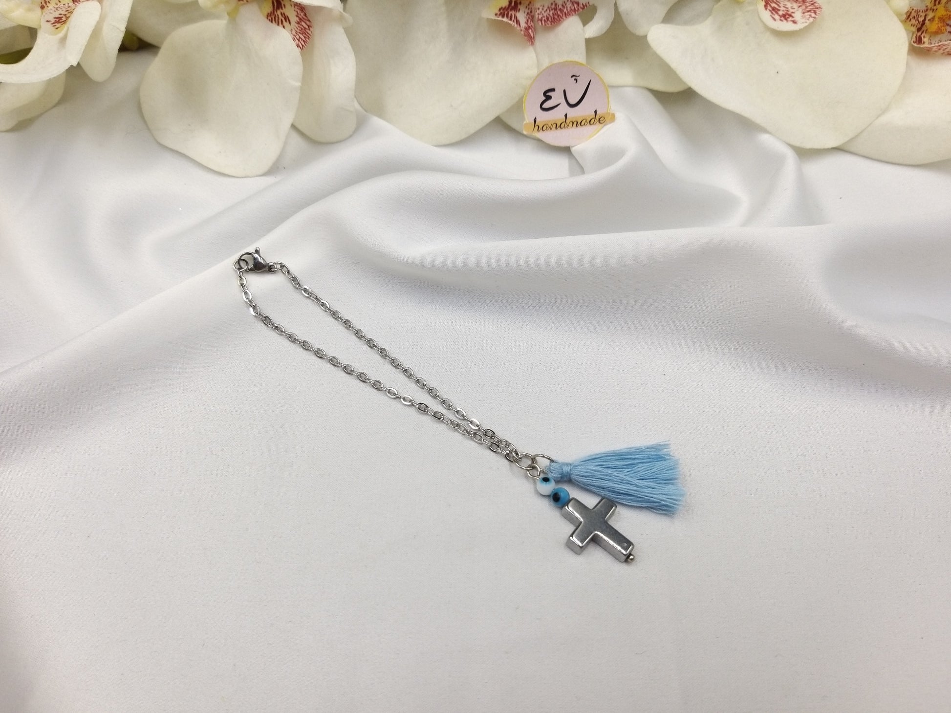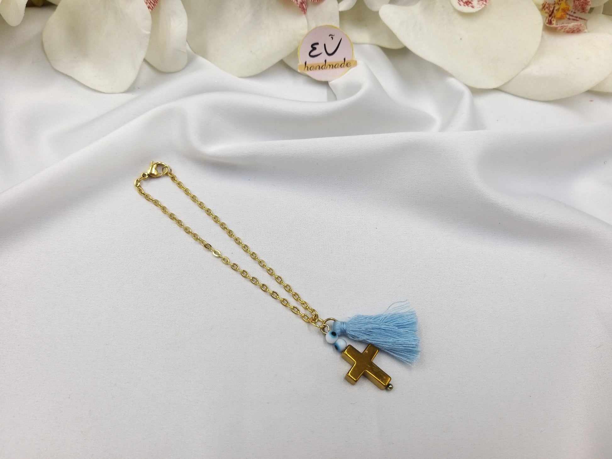 Γούρι αυτοκινήτου με ατσάλινη αλυσίδα, γυάλινα ματάκια, φουντακι και σταυρό από αιματίτη σε χρυσαφί και ασημί.